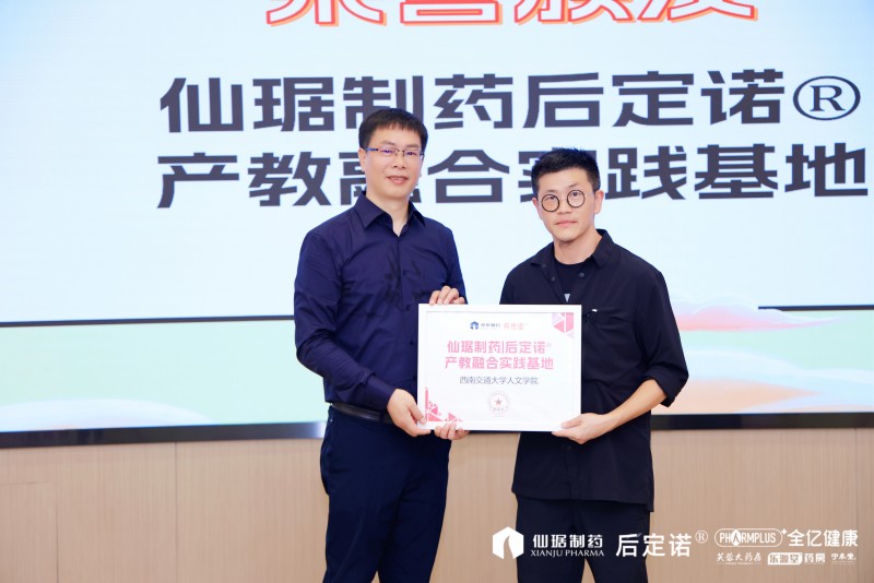 全億健康成都事業部總經理 何英女士 榮譽頒發:產教融合基地落地交大 在全場關注下,仙琚制藥 OTC 事業部總監泮小波先生為西南交通大學人文學院代表李陽老師頒發《仙琚制藥 | 后定諾 ® 產教融合人才實踐基地》證書。李陽老師接過證書并表示,實踐基地的成立將推動健康傳播人才培養模式創新,實現教學與行業實踐的深度銜接。